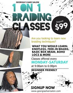 First class style your downtown salon. Please visit my hair braiding classes website. I am now also offering: Training is done by cosmetologist and master braider / natural hair care specialist. 290 hilderbrand dr ste b9.